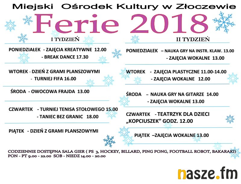 Podczas ferii nie zabraknie też zajęć dla fanów sportu, o które zadbali pracownicy Miejskiego Ośrodka Sportu i Rekreacji.