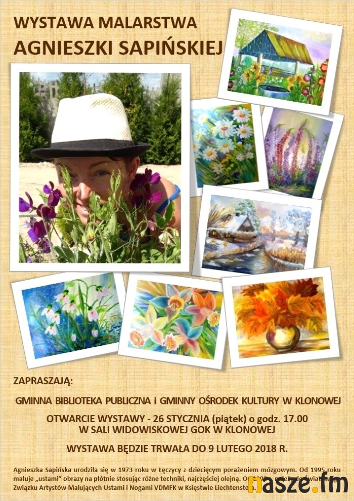 Gminna Biblioteka Publiczna i Gminny Ośrodek Kultury w Klonowej zapraszają 26 stycznia na otwarcie wystawy Agnieszki Sapińskiej. Artystka "maluje ustami" obrazy na płótnie.