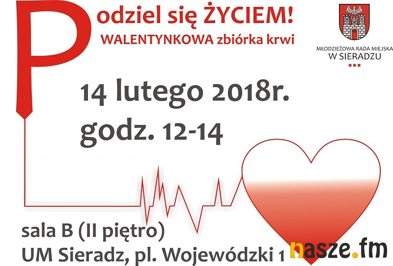 Młodzieżowa Rada Miejska w Sieradzu oraz Regionalne Centrum Krwiodawstwa i Krwiolecznictwa w Łodzi punkt pobrań w Sieradzu zapraszają na walentynkową zbiórkę krwi.