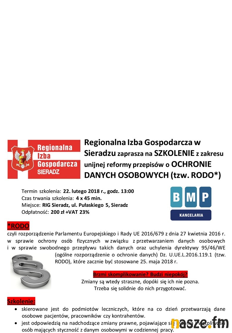 - Będzie to szkolenie dedykowane dla podmiotów leczniczych, które na co dzień przetwarzają dane osobowe pacjentów, pracowników czy kontrahentów. Osoba, która weźmie udział w tym szkoleniu uzyska informacje na temat zmieniającego się prawa, które wejdzie w życie od maja tego roku. Chodzi o ustawę o ochronie danych osobowych tzw. RODO. Podczas szkolenia zostaną przekazane szczegółowe informacje techniczne, które będą przydatne w codziennej pracy i analizie wszystkich spraw związanych z ochroną danych osobowych - mówi Sławomir Balcerzak, prezes Regionalnej Izby Gospodarczej w Sieradzu.