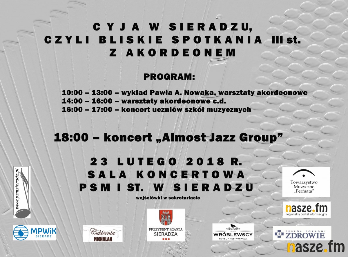 W piątek 23 lutego w Państwowej Szkole Muzycznej I st. w Sieradzu będzie królować muzyka akordeonowa. W ramach wydarzenia pod nazwą "Cyja w Sieradzu, czyli bliskie spotkania III stopnia z akordeonem" zaplanowano wykłady, warsztaty i koncerty. Tego dnia na scenie sali koncertowej szkoły wystąpi Almost Jazz Group.