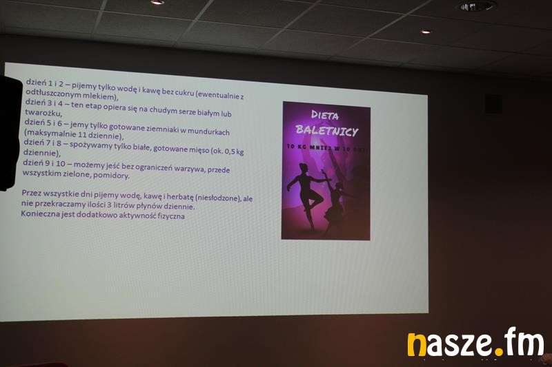 Po obejrzeniu i wysłuchaniu prezentacji multimedialnej, dietetyk opowiedziała na czym polega zdrowa dieta i co to pojęcie oznacza, jakie powinny być w niej źródła składników odżywczych i ile powinien wynosić optymalny spadek masy ciała.