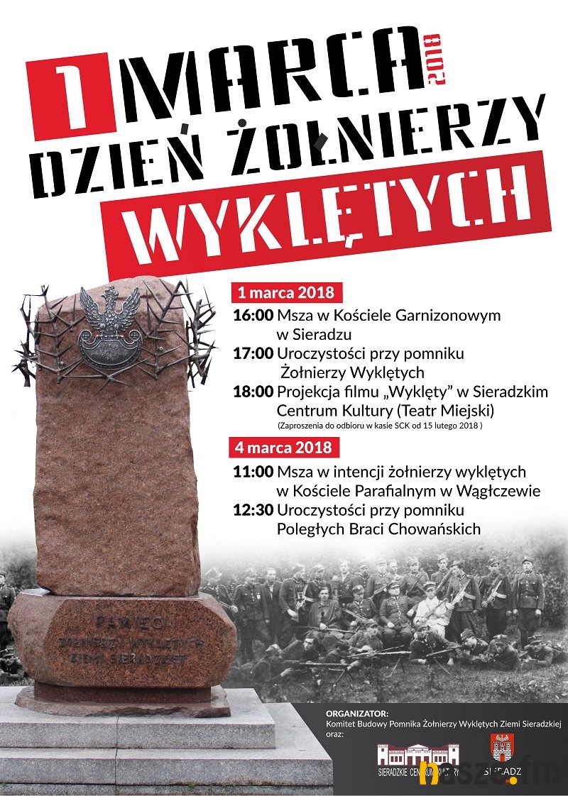 Tego samego dnia o 18:00 w Sieradzkim Centrum Kultury odbędzie się projekcja filmu Wyklęty (na to wydarzenie zaproszenia można odbierać w kasie Teatru Miejskiego).