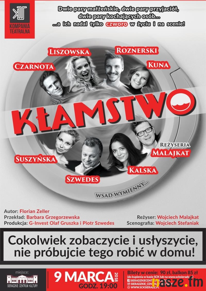 W najbliższy piątek na deskach sieradzkiego teatru wystawiony zostanie spektakl "Kłamstwo". W rolach głównych: Liszowska, Suszyńska, Malajkat i Roznerski. Początek o godzinie 19.
