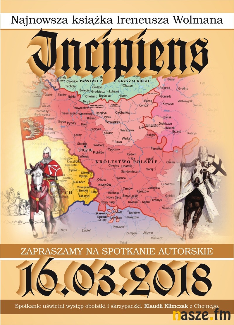 - Incipiens po polsku oznacza początek. Spotkanie autorskie z autorem książki Ireneuszem Wolmanem odbędzie się 16 marca w budynku Gimnazjum nr 3 w Sieradzu, przy ulicy Broniewskiego 30. Podczas spotkania autor zaprezentuje książkę historyczną, której akcja toczy się w latach 1400 - 1433. Przedstawione są w niej losy dziedzica i rycerza Mszczuja Barczewskiego oraz Maćka, młodego chłopaka z Choynego, a później sołtysa tej wioski. Ich przygody i dokonania zostały wpisane w autentyczne wydarzenia, które miały miejsce na Ziemi Sieradzkiej i w Królestwie Polskim - informuje Zbigniew Łuczak, dyrektor Miejskiej Biblioteki Publicznej w Sieradzu.
