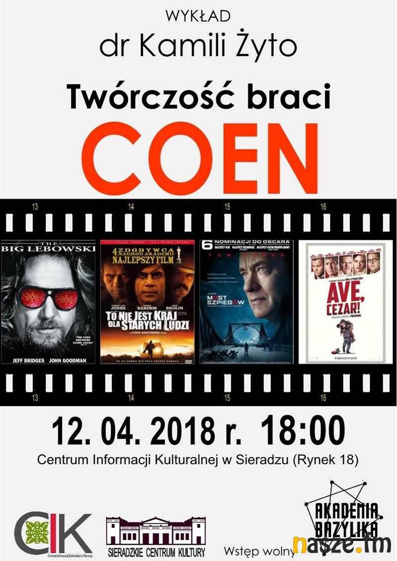 Dziś w Centrum Informacji Kulturalnej w Sieradzu odbędzie się wykład dr Kamili Żyto z Instytutu Kultury Współczesnej Uniwersytetu Łódzkiego. Filmoznawczyni opowiadać będzie o twórczości wielokrotnie nagradzanych braci Coen. Wykład organizowany w ramach projektu Akademia Bazylika. Początek o godzinie 18.