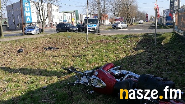 Gdy był już na przeciwległym pasie ruchu, uderzył w niego jadący w tym samym kierunku motocykl, którego kierowca prawdopodobnie podjął manewr wyprzedzania. Motocykl uderzył w lewe drzwi samochodu, a następnie odbił się i zatrzymał kilkanaście metrów dalej na trawie. Kierujący motocyklem 43-letni mężczyzna z ogólnymi obrażeniami ciała został przewieziony do sieradzkiego szpitala. Pobrano mu krew do badań na zawartość alkoholu.