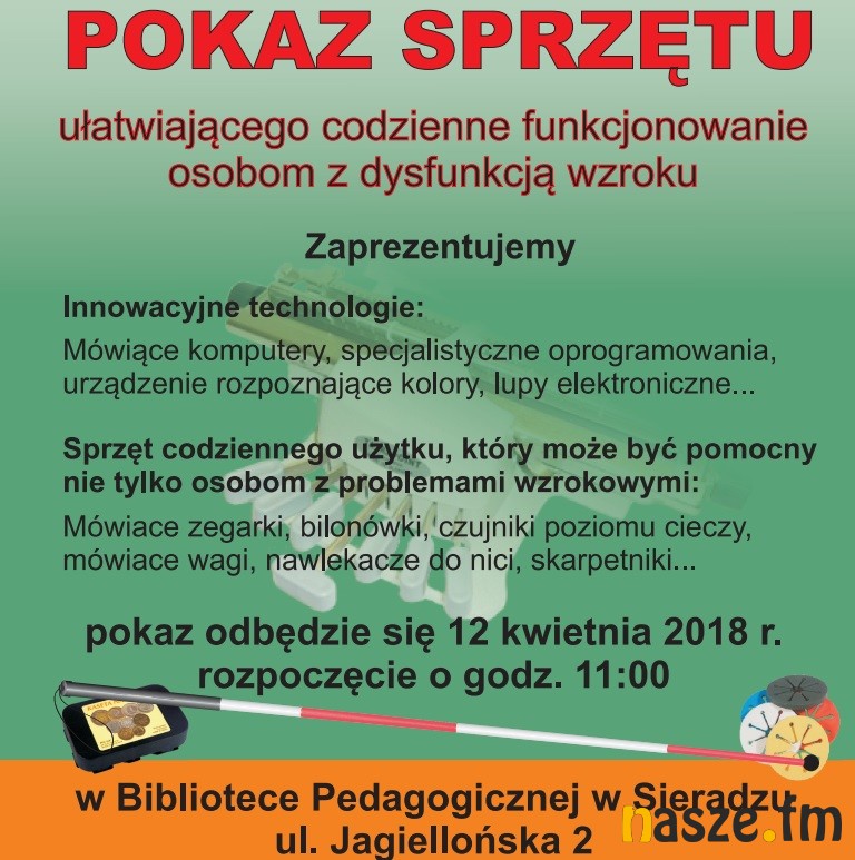 - Warto przyjść na to spotkanie, żeby zobaczyć że są urządzenia, które mogą ułatwić życie także seniorom. Bedą bilonówki, które pomagają nam niewidiowym lub niedowidzącym ułożyć monety i dzięki temu łatwiej nam płacić w sklepach. Będą czujniki pomiaru cieczy, dzięki którym nie nalewamy za dużo wody. Nie zabraknie komputerów, które mówią i są fenomenalnym sprzętem pozwalającym niewidomym tworzyć dokumenty tekstowe. Zapraszamy serdecznie wszystkich mieszkańców Sieradza, ludzi z dysfunkcją wzroku którzy niekoniecznie są zrzeszeni w naszym kole żeby przyszli do siedziby Biblioteki Pedagogicznej w Sieradzu przy ulic Jagiellońskiej 2 i sprawdzili jak można ułatwiać sobie życie - mówi Alicja Nyziak, prezes Koła Terenowego Polskiego Związku Osób Niewidomych w Sieradzu.