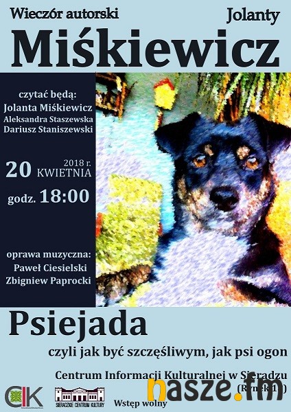 Centrum Informacji Kulturalnej w Sieradzu, zaprasza 20 kwietnia na wieczór autorski Jolanty Miśkiewicz, pt: "Psiejada, czyli jak być szczęśliwym jak psi ogon".