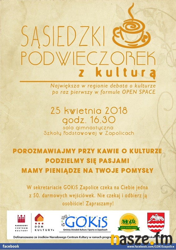 Takie hasło towarzyszy debacie o kulturze, którą w najbliższą środę (25.04) organizuje Gminny Ośrodek Kultury i Sportu w Zapolicach. To pierwsze tego typu wydarzenie w naszym regionie w formule OPEN SPACE.