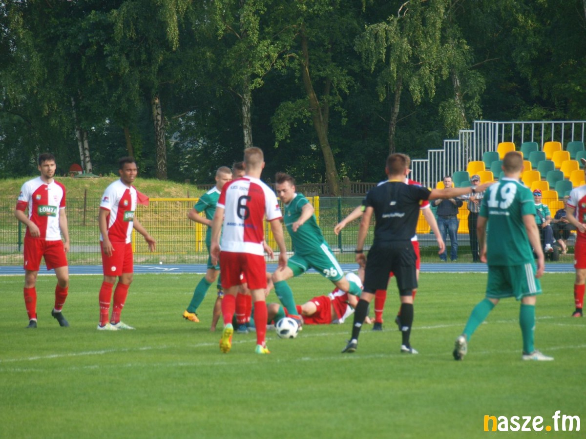 Ten mecz był bardzo ważny dla obydwu drużyn. Wygrana Warty przedłużała jej szansę na uratowanie się przed spadkiem, natomiast zwycięstwo gości praktycznie dawało im utrzymanie. Swój cel osiągnęła drużyna z Łomży, choć pierwsza część spotkania wcale na to nie wskazywała. Przez pierwsze 45 minut to gospodarze byli stroną przeważającą, ale swojej przewagi nie potrafili udokumentować golem. Brak skuteczności zemścił się na biało-zielonych po przerwie. W 53. minucie kapitalnym uderzeniem z rzutu wolnego popisał się Marcin Świderski i Mateusz Wlazłowski - choć wyciągnął się, jak struna - musiał skapitulować. Te gol wyraźnie podłamał gospodarzy, którzy nie grali już tak dobrze, jak przed przerwą. Nie pomogły też przeprowadzone przez Dariusza Bratkowskiego zmiany. Miejscowych dobił w 90. minucie Daniel Kacprzyk, który zauważył wysoko stojącego Wlazłowskiego i przelobował go precyzyjnym strzałem pod poprzeczkę. Kilka minut wcześniej zagotowało się przy ławce rezerwowych Warty. Po jednej z decyzji sędziego (w polu karnym zahaczany był Wiktor Płaneta, ale arbiter odgwizdał faul piłkarza Warty) gracze z ławki dość żywiołowo zaczęli protestować. Arbiter ukarał dwukrotnie żółtą kartką Marcina Kobierskiego, który wcześniej został zmieniony i w konsekwencji napastnik sieradzan obejrzał czerwony kartonik.