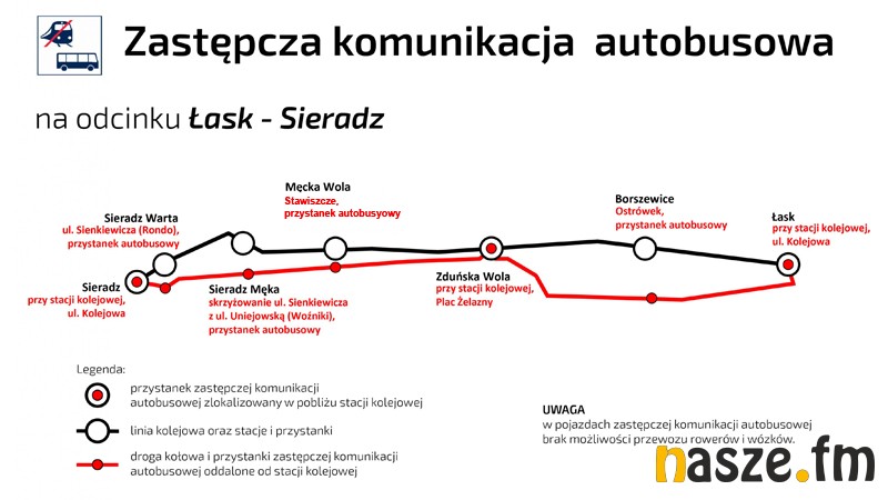 Od wczoraj (10.06) obowiązuje zmieniona organizacja ruchu pociągów. Ze względu na prace remontowe na linii sieradzkiej znacznie zmniejszyła się przepustowość jednotorowego odcinka Łask – Zduńska Wola. Jednocześnie prowadzona jest przebudowa stacji: Łask i Zduńska Wola, co spowodowało wprowadzenie zastępczej komunikacji autobusowej pomiędzy Łaskiem a Sieradzem.