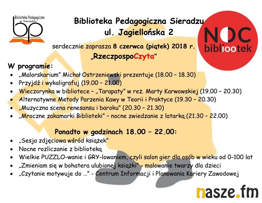 - Po raz kolejny nasz biblioteka włącza sie w ogólnopolską akcję "Noc bibliotek". Hasło "RzeczpospoCzyta" to gra słów, która zwraca uwagę na dwie uroczystości, czyli setną rocznicę odzyskania przez Polskę niepodległości oraz czytanie, krzewienie kultury czytelniczej wśród społeczeństwa. Zaplanowaliśmy mnóstwo atrakcji, zarówno dla najmłodszych jak i dorosłych mieszkańców regionu. Mam nadzieję, że każdy kto pojawi się w naszej placówce znajdzie dla siebie przestrzeń, w której poczuje się dobrze. Zapraszam bardzo serdecznie - zapowiada Elżbieta Kowalska, dyrektor Biblioteki Pedagogicznej w Sieradzu.