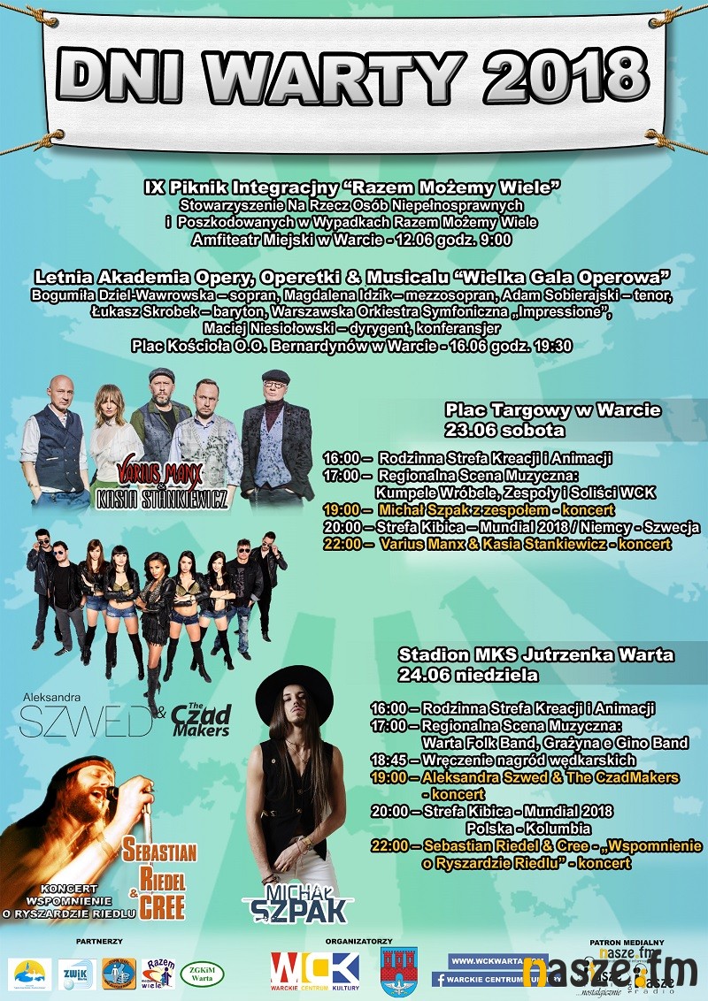 23 czerwca na Dniach Warty wystąpi Michał Szpak. Na scenie w Warcie zagra także zespół Sebastiana Riedla, czyli Cree, ten koncert zaplanowano na 24 czerwca, początek o 21.