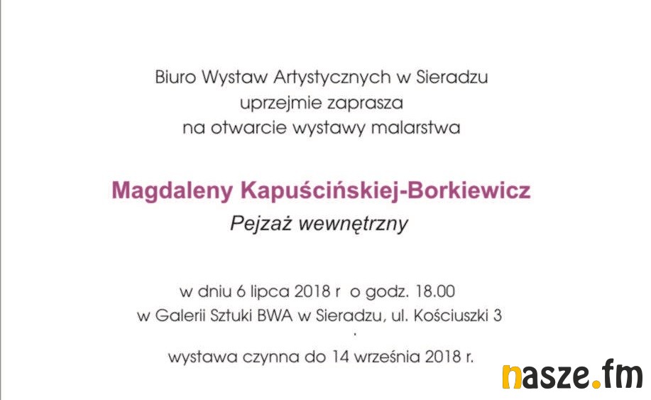 Jutro ( piątek 6 lipca ) w Biurze Wystaw Artystycznych w Sieradzu (ul. Kościuszki 3) na godz. 18:00 zaplanowano otwarcie wystawy malarstwa Magdaleny Kapuścińskiej-Borkiewicz. Ekspozycja jest zatytułowana "Pejzaż wewnętrzny".