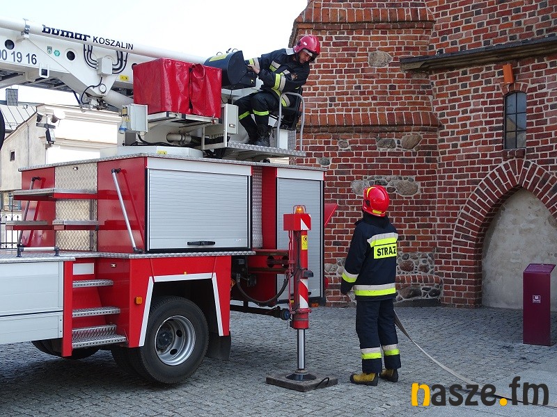 Ratownicy z Państwowej Straży Pożarnej w Sieradzu rozpoczęli dziś cykl ćwiczeń przeciwpożarowych w obrębie Bazyliki Mniejszej w Sieradzu. Gasili tam symulowany pożar świątyni.