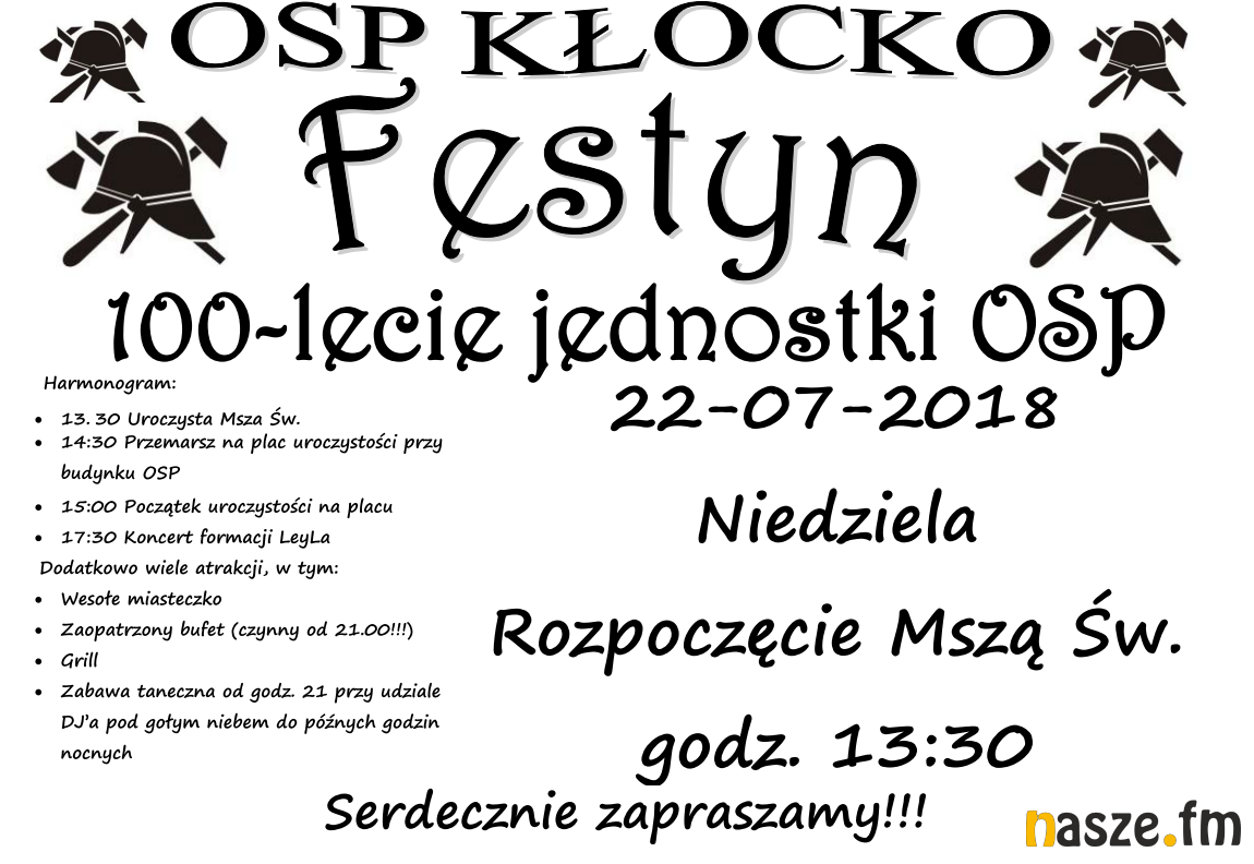Ochotnicza Straż Pożarna w Kłocku zaprasza w niedzielę 22 lipca, na obchody 100- lecia powstania jednostki. W programie uroczystości m.in. przedstawienie rysu historycznego jednostki OSP oraz wręczenie medali i wyróżnień. Organizatorzy zapewniają też część nieoficjalną: festyn rodzinny, który zakończy zabawa pod chmurką.