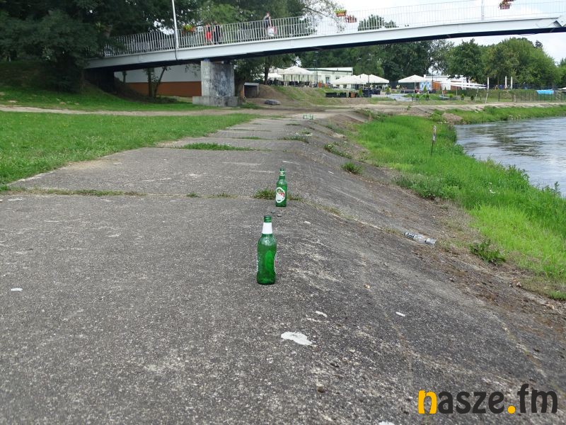 Na plażę wybraliśmy się z aparatem. Już po chwili w otoczeniu rzeki natrafiliśmy na butelki, szkło i niedopałki papierosów. Jak zauważają plażowicze nie jest to ogromna skala, problem nie leży po stronie zarządcy, a samych śmiecących. Są kosze na śmieci, jednak wielu wyrzuca je gdzie popadnie. Do tego celowo tłuczone butelki. Generalnie nie ma tragedii, ale powinno być lepiej.