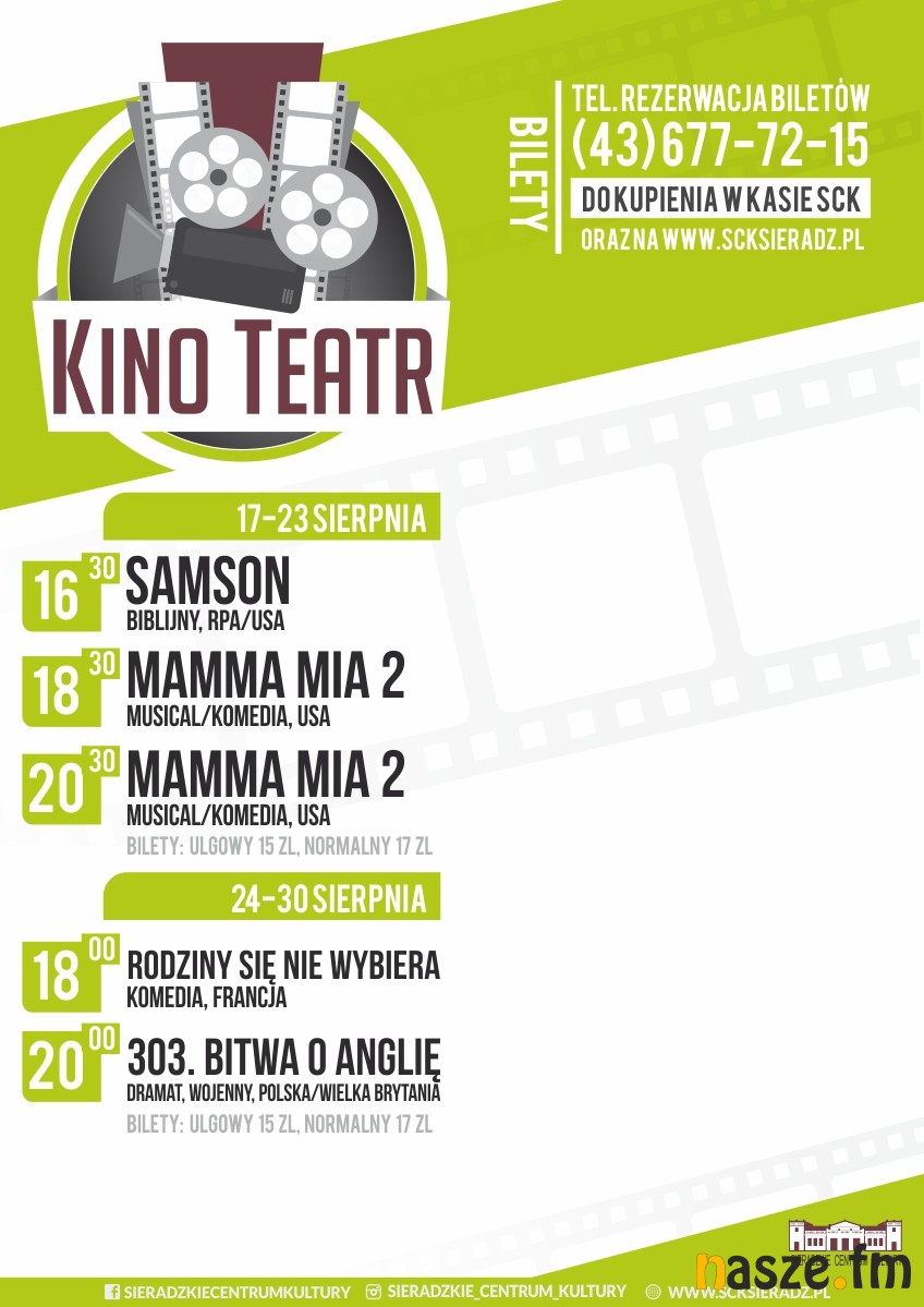Do 30 sierpnia w sieradzkim Kinie Teatr będziecie mogli obejrzeć nowości filmowe. Jeszcze dziś na ekranie wyświetlone zostaną filmy Samson i musical Mamma Mia: Here We Go Again!. Od jutra możecie wybrać się na dramat wojenny 303. Bitwa o Anglię oraz francuska komedia Rodziny się nie wybiera.