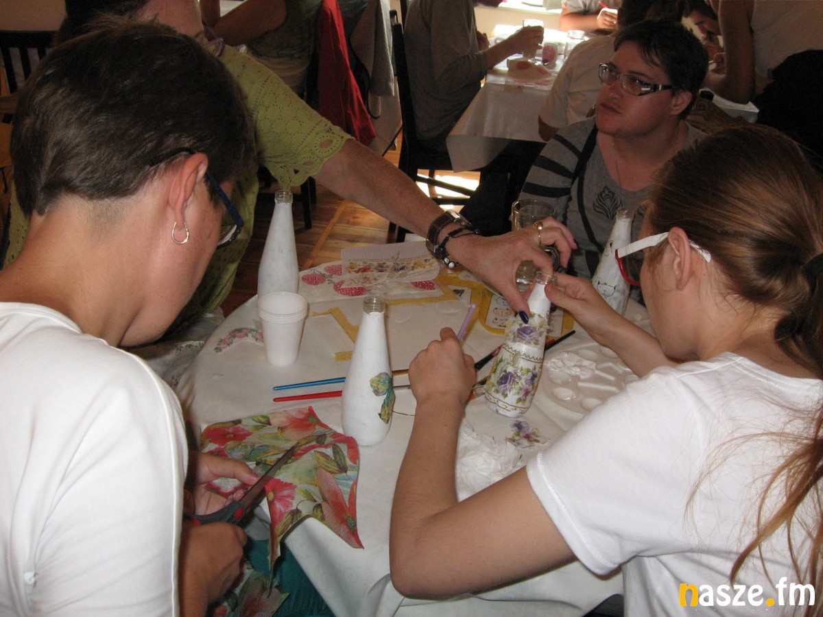 Uzupełnieniem zwiedzania były warsztaty decoupage, przeprowadzone w kawiarni "U Tkaczy". Specjalnie z okazji przyjazdu wycieczki z Sieradza, przeprowadziły je przedstawicielki zgierskiego koła Polskiego Stowarzyszenia na rzecz Osób z Niepełnosprawnością Intelektualną. Efektem warsztatów są pamiątki z wyjazdu - udekorowane szklane naczynia.