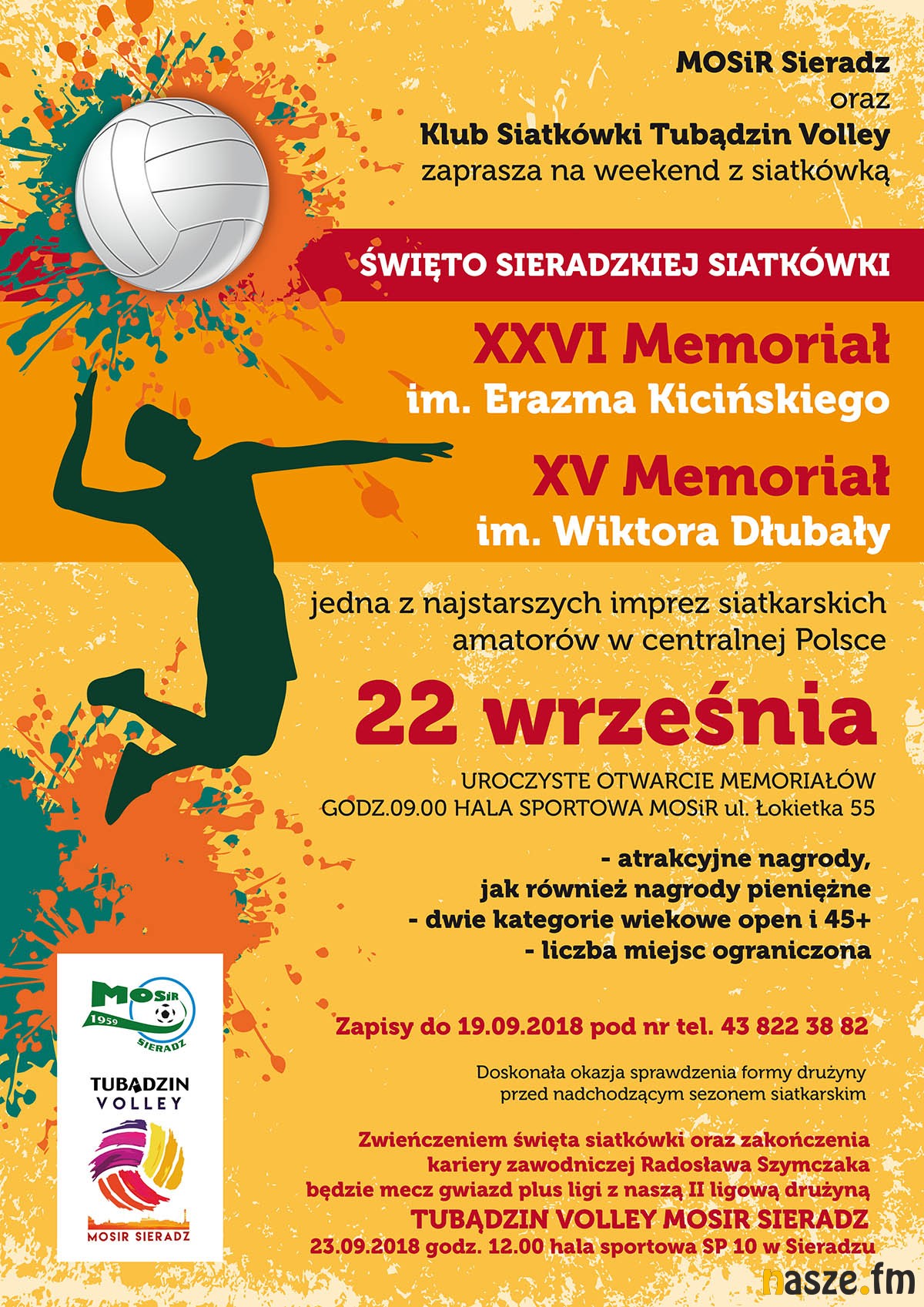 W sobotę (22 września) rozegrany zostanie turniej amatorów, będą to memoriały Erazma Kicińskiego i Wiktora Dłubały. Zawody odbędą się w dwóch kategoriach: open i +45 lat. Turniej jest z nazwy amatorski, ale nie ma żadnych ograniczeń, jeśli chodzi o zawodników. Teoretycznie mogą to być nawet siatkarze z najwyższych lig. Zapisy do 19 września przyjmuje Miejski ośrodek Sportu i Rekreacji w Sieradzu (tel. 43 822 38 82).