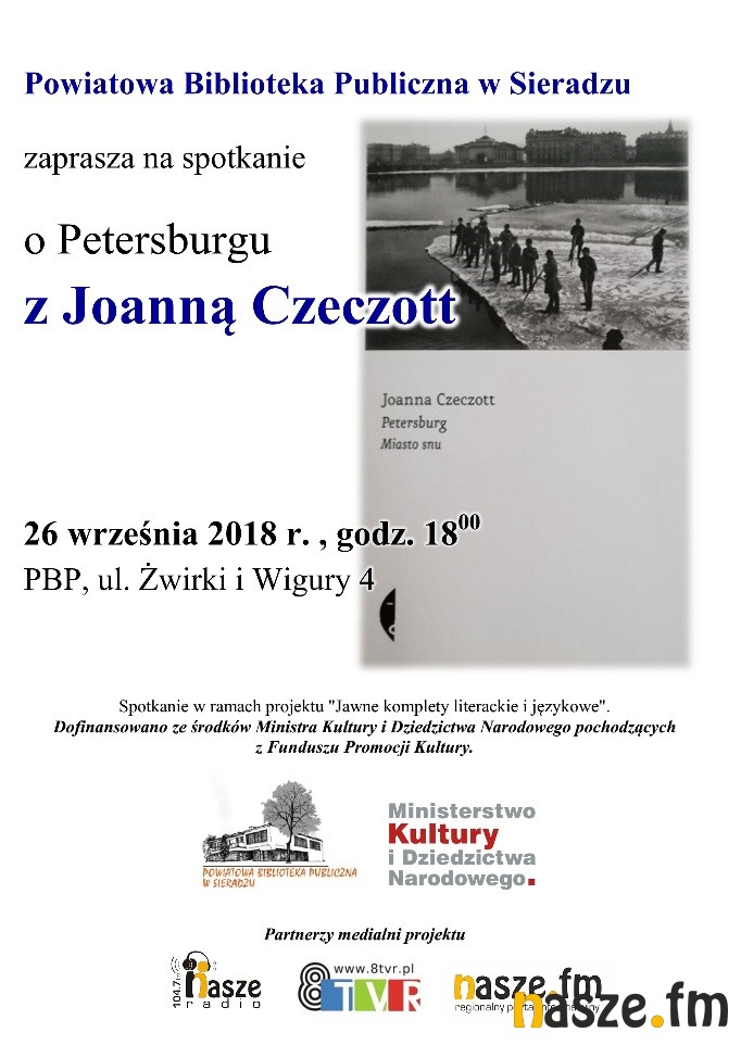 - Chcemy Państwa zaprosić na spotkanie z Joanną Czeczott. Petersburg ma bardzo bogatą historię. Miasto to kilkakrotnie zmieniało swoją nazwę i pomimo niezliczonych klęsk i wojen zawsze podnosiło się z upadku. Joanna Czeczott opowie nam o historii miasta oraz o jego współczesnym obliczu, na pewno usłyszymy tez o białych nocach. Autorka poznała dobrze Petersburg dlatego, że tam pracowała - wyjaśnia Zofia Olechnowicz z PBP w Sieradzu.