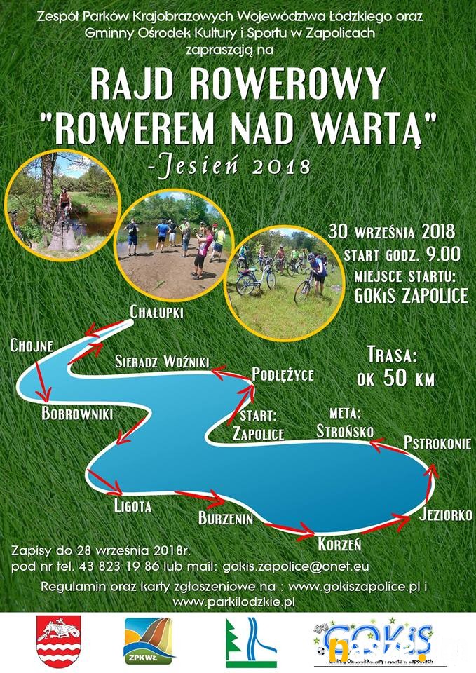 Trwają zapisy na kolejny rajd rowerowy "Rowerem nad Wartą", który organizują: Gminny Ośrodek Kultury i Sportu w Zapolicach oraz Zespół Parków Krajobrazowych Województwa Łódzkiego. Rowerowa podróż po terenach międzyrzecza Warty i Widawki odbędzie się w najbliższą niedzielę 30 września.