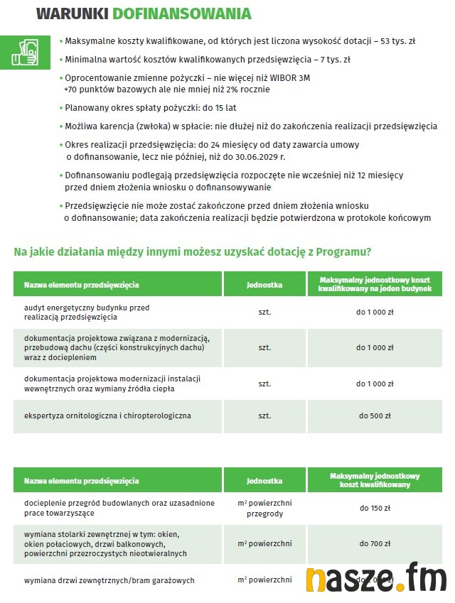 Korzystając z programu możecie uzyskać zwrot części poniesionych kosztów. Maksymalne koszty kwalifikowane przewidziane do wsparcia dotacyjnego wynoszą 53 tys. zł. Jeśli koszt realizacji inwestycji przekroczy tę kwotę, dodatkowe koszty mogą być dofinansowane w formie pożyczki. Minimalny koszt projektu to 7 tys. zł.