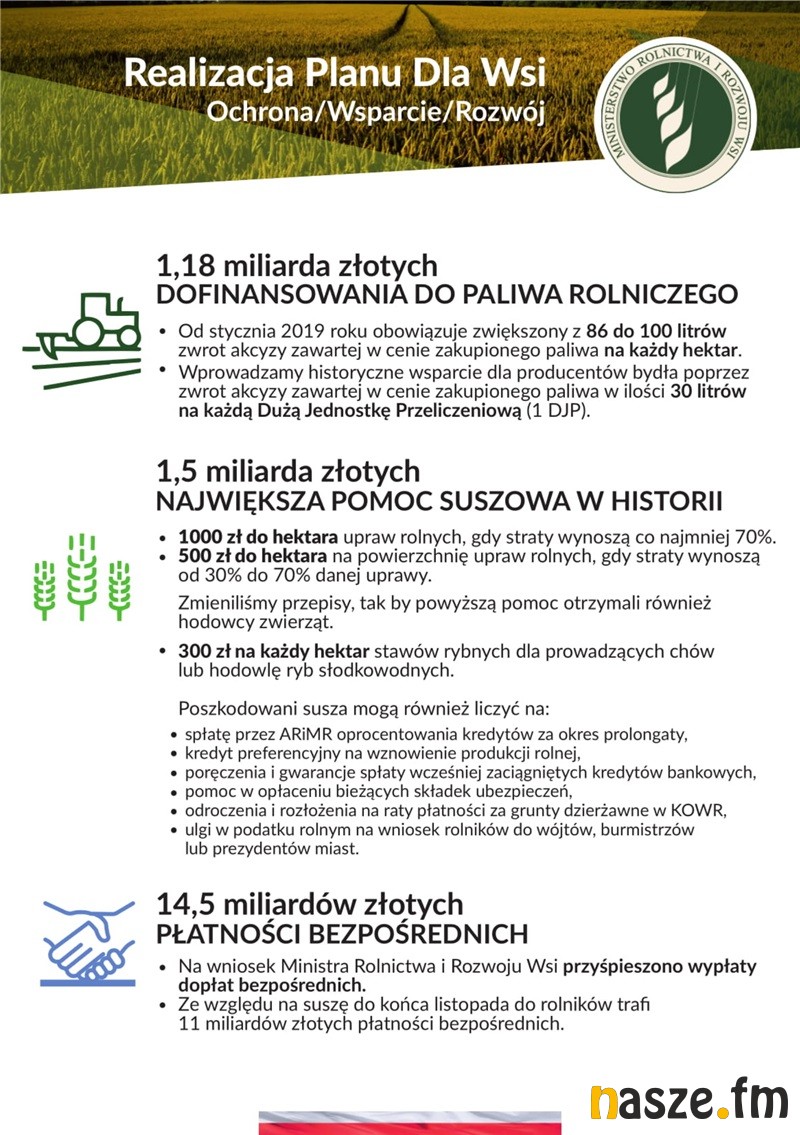 ARiMR przekazała także informację o stanie bieżących wypłat rekompensat za straty spowodowane tegoroczną suszą. Do 15 października rolnicy złożyli blisko 200 tys. wniosków na łączną kwotę ok. 1,17 mld zł. Agencja wydała ok. 56 tys. decyzji przyznających pomoc wysokości prawie 340 mln zł i wypłaciła rolnikom ponad 283 mln zł.