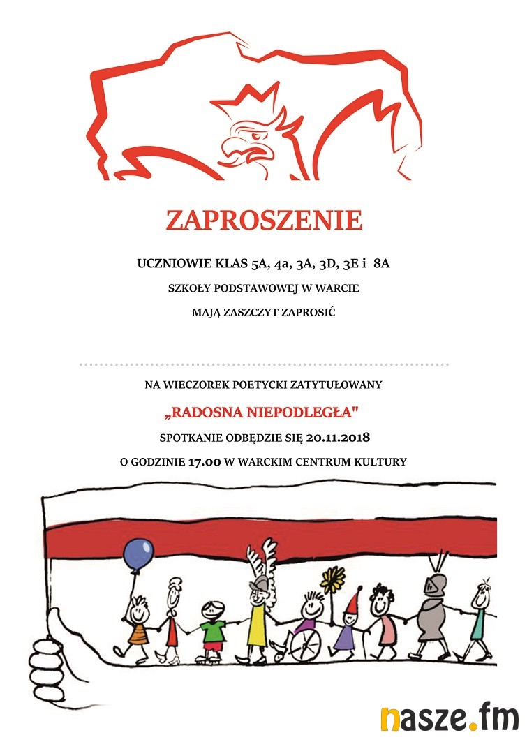 Dziś w Warckim Centrum Kultury odbędzie się wieczorek poetycki zatytułowany "Radosna niepodległa", przygotowany przez uczniów klas 4-8 Szkoły Podstawowej w Warcie i klasy 3. oddziałów gimnazjalnych. Początek o godz. 17:00, wstęp wolny.