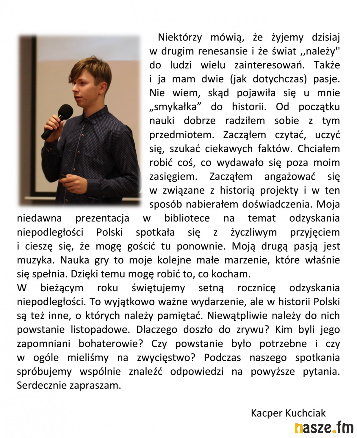 Kacper Kuchciak jest uczniem klasy II I Liceum Ogólnokształcącego im. Kazimierza Jagiellończyka w Sieradzu i dziś w Powiatowej Bibliotece Publicznej w Sieradzu wygłosi wykład zatytułowany "Powstanie listopadowe - dzieło marzycieli czy szansa na niepodległość?" Początek o godz. 18:00, wstęp wolny.