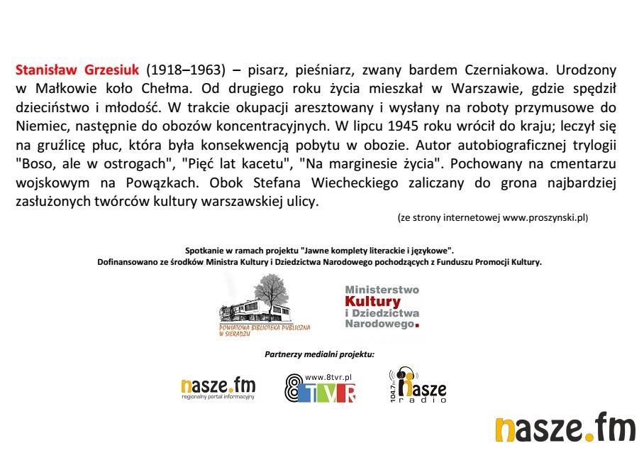 O pisarzu i bardzie Czerniakowa opowie Michał Nalewski - redaktor prowadzący wznowień książek S. Grzesiuka. Początek spotkania o godz. 18:00, wstęp wolny.