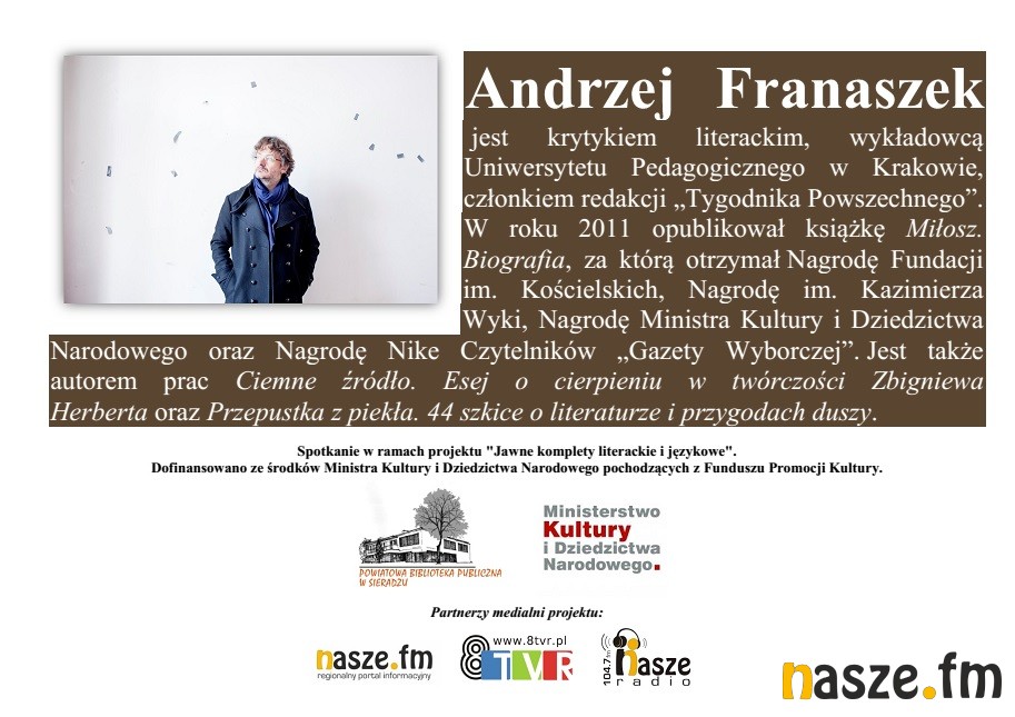 - Wcześniej mieliśmy takie spotkanie podczas, którego Ewa Dałkowska czytała wiersze poety, a teraz będziemy mogli się spotkać z Andrzejem Franaszkiem, który napisał bardzo wyczerpujące, dokładne biografie Herberta. Zapraszamy Państwa w piątek 7 grudnia na spotkanie, które zatytułowaliśmy "Zbigniew Herbert - We mnie jest płomień, który myśli" - zapowiada Zofia Olechnowicz z biblioteki przy ul. Żwirki i Wigury w Sieradzu.