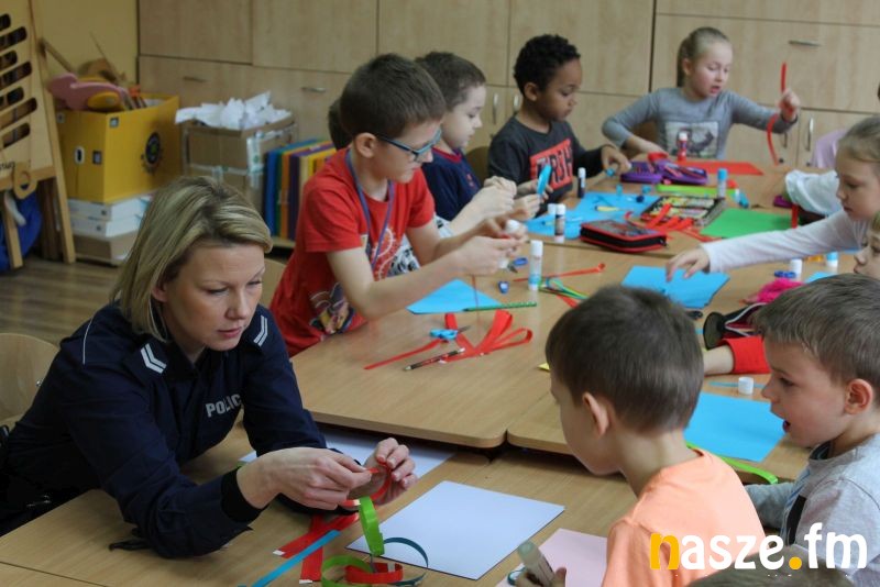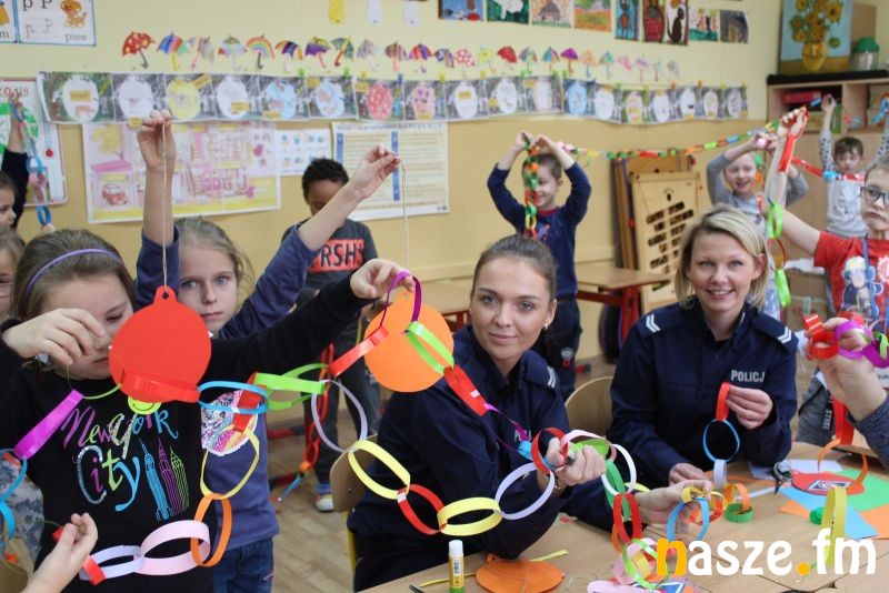 Wczoraj uczniowie klasy pierwszej Szkoły Podstawowej nr 11 wraz z policjantkami wykonali ozdoby świąteczne na choinkę. Jak pokazuje doświadczenie, dzieci najlepiej uczą się poprzez zabawę. Dlatego st. sierż Kamila Sowińska zadając dzieciom pytania z zakresu wiedzy o bezpieczeństwie przypominała im, jak należy zachowywać się w rejonie przejść dla pieszych oraz przy przechodzeniu przez jezdnię. Uczyła także jak bezpiecznie podróżować z rodziną samochodem i jak ważne są odblaski noszone przez pieszych.