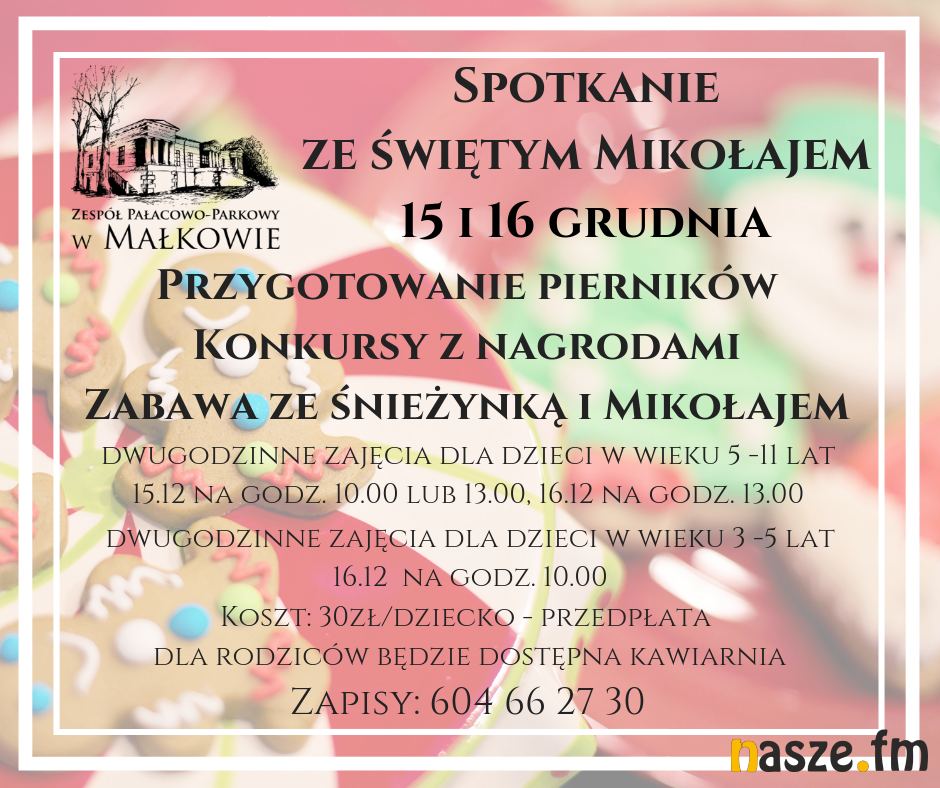 W pałacu w Małkowie odbędą się w przyszłym tygodniu warsztaty świąteczne. Dzieci będą wycinać i ozdabiać pierniki, dorośli tworzyć wianuszki świąteczne. Organizatorzy planują też konkursy z nagrodami.