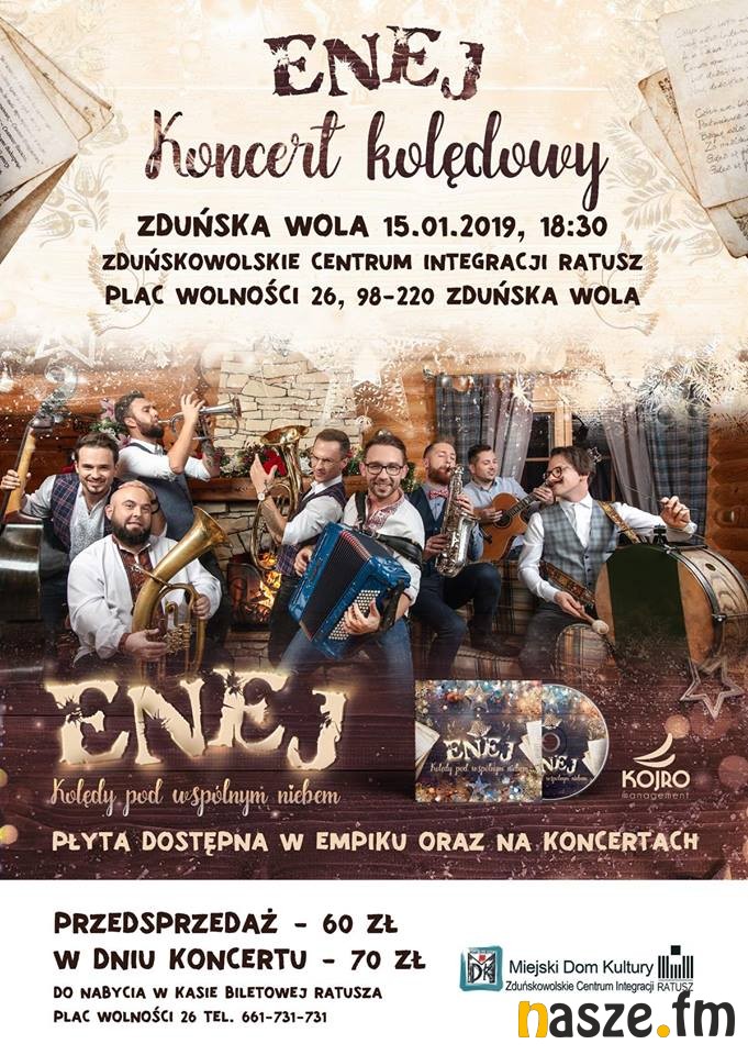 15 stycznia w zduńskowolskim Centrum Integracji Ratusz w świat kolęd zabierze Was zespół Enej. To za sprawą premiery ich najnowszej płyty "Kolędy pod wspólnym niebem". Bilety do nabycia w kasie ratusza.