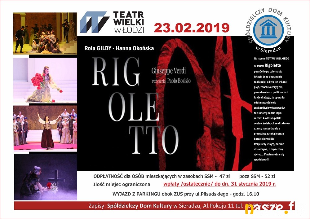 Spółdzielczy Dom Kultury w Sieradzu zaprasza 23 lutego na wycieczkę do Teatru Wielkiego w Łodzi, na słynną operę Rigoletto. W roli Gildy pochodząca z Warty- Hanna Okońska.