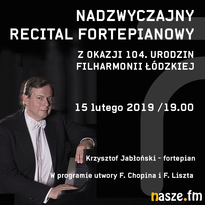 Za początek dziejów Filharmonii Łódzkiej uważa się dzień 17 lutego, gdyż wtedy, w roku 1915, odbył się pierwszy koncert Łódzkiej Orkiestry Symfonicznej. 104. urodziny Filharmonii Łódzkiej uświetnione zostaną recitalem fortepianowym, nawiązującym do działalności artystycznej patrona instytucji, Artura Rubinsteina. Wystąpi wybitny pianista Krzysztof Jabłoński, od ponad 30 lat aktywny solista i kameralista, koncertujący na estradach Europy, Azji i obu Ameryk. Od 1985 r., kiedy został laureatem XI Konkursu Chopinowskiego w Warszawie, w jego repertuarze ważne miejsce zajmuje muzyka Fryderyka Chopina. Jego utwory wykonywał m.in. podczas słynnego Balu w Operze Wiedeńskiej, w ramach jubileuszu 30-lecia pracy artystycznej w Tokio oraz w Filharmonii Narodowej w Warszawie na festiwalu "Chopin i jego Europa". Usłyszymy także muzykę Franza Liszta, w tym fragment monumentalnego cyklu "Lata pielgrzymstwa", który stanowi zapis wrażeń z podróży (rok I odzwierciedla wrażenia z wyprawy do Szwajcarii) oraz "Pogrzeb" z rzadko wykonywanych "Harmonii poetyckich i religijnych". Drugi z utworów dedykowany jest polskiej księżnej Karolinie Sayn-Wittgenstein, która była partnerką kompozytora i wywarła znaczny wpływ na jego twórczość.