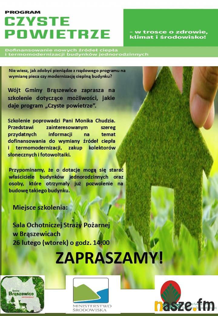 Mieszkańcy gminy Brąszewice będą mogli poznać bliżej założenia programu "Czyste powietrze". Szkolenie dla zainteresowanych odbędzie się w siedzibie miejscowej Ochotniczej Straży Pożarnej.