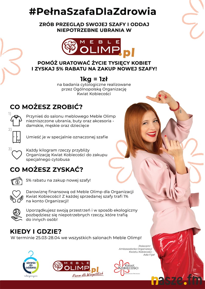 W całej Polsce w terminie 25.3-28.04 odwiedzający salony Meble Olimp zobaczą specjalnie oznaczone szafy, gdzie można będzie zostawić niepotrzebną odzież. W ramach akcji do salonów przynieść można niezniszczone ubrania damskie, męskie oraz dziecięce (spakowane w reklamówki), a każdy 1 kg ubrań zasili konto Organizacji Kwiat Kobiecości o 1zł.