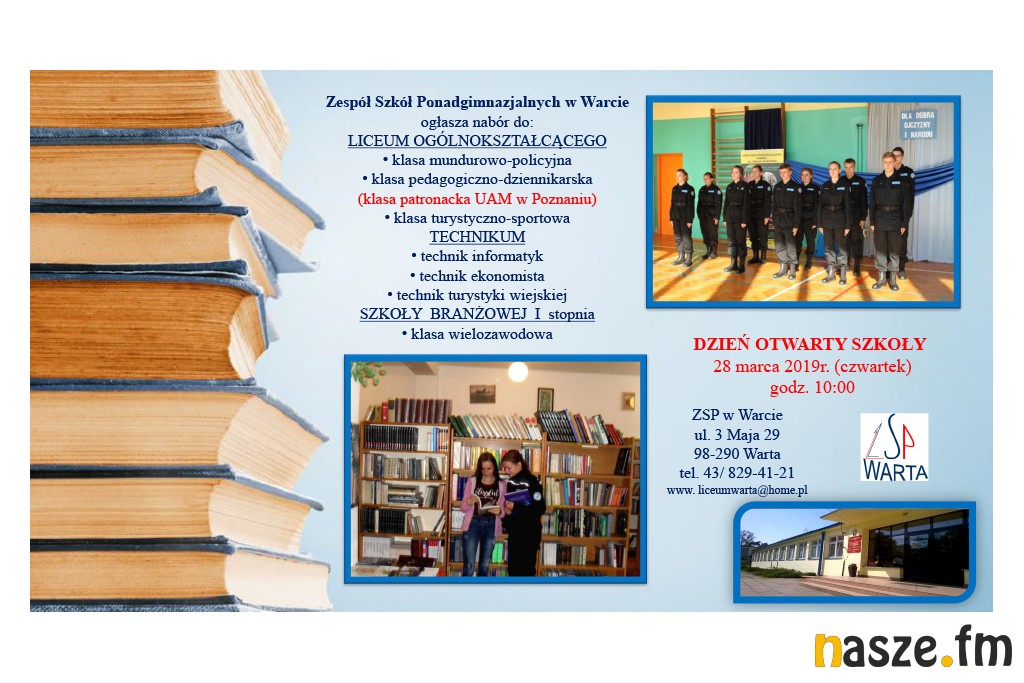 Zespół Szkół Ponadgimnazjalnych w Warcie ogłosił nabór do Liceum Ogólnokształcącego (klasy mundurowo - policyjna, pedagogiczno - dziennikarska i turystyczno - sportowa), Technikum (w kierunkach technik informatyk, ekonomista i turystyki wiejskiej) oraz Szkoły Branżowej I stopnia (klasa wielozawodowa). W związku z tym przedstawiciele placówki zapraszają na Dzień Otwarty. Będzie to przede wszystkim możliwość zapoznania się z ofertą oraz porozmawiania z nauczycielami i młodzieżą.