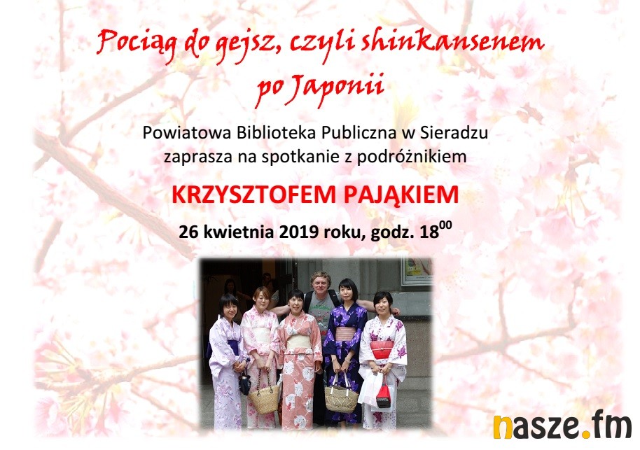 Powiatowa Biblioteka Publiczna w Sieradzu zaprasza dziś na spotkanie z Krzysztofem Pająkiem - "Pociąg do gejsz, czyli shinkansenem po Japonii". Początek o godz. 18:00.