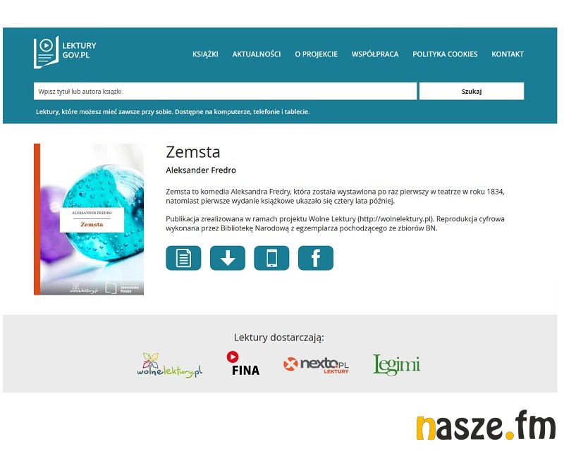 Wyniki najnowszego badania NASK "Nastolatki 3.0" pokazuje, że 15, 5 proc. polskich nastolatków używa Internetu do poszerzania wiedzy potrzebnej do szkoły. Nieco ponad 21 proc. - do przygotowania do klasówek i sprawdzianów, 50 proc. - do odrabiania lekcji, a ponad 65 proc. - do słuchania muzyki. Na lektury.gov.pl jest też coś do posłuchania. Książki są tam udostępnione poprzez zawarty w serwisie czytnik ebooków lub odtwarzacz audiobooków. Możesz też ściągnąć wygodną aplikację mobilną. Serwis daje dostęp do ponad 220 darmowych nagrań. Możesz ich słuchać w trakcie uprawiania sportu, wykonywania obowiązków domowych czy jazdy autobusem. Nagrania to doskonałe rozwiązanie dla wszystkich tych, którzy nie mogą korzystać z tradycyjnych książek.