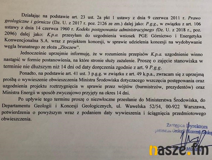 Działając na podstawie art. 41 ust. 3 ustawy z dnia 9 czerwca 2011 r. – Prawo geologiczne i górnicze (Dz. U. z 2017 r., poz. 2126 ze zm., dalej jako: P.g.g.), w związku z art. 49 ustawy z dnia 14 czerwca 1960 r. – Kodeks postępowania administracyjnego (Dz. U. z 2019 r., poz. 2096 ze zm., dalej jako: K.p.a.), zawiadamiam, że na wniosek PGE Górnictwo i Energetyka Konwencjonalna S.A. zostało wszczęte postępowanie w sprawie udzielenia koncesji na wydobycie węgla brunatnego ze złoża „Złoczew&rdquo, położonym na terenie gminy miejskiej i wiejskiej Złoczew, gminy Burzenin, pow. sieradzki, gminy Ostrówek, pow. wieluński oraz gminy Lututów, pow. wieruszowski, woj. łódzkie.Wniosek o udzielenie koncesji przesłano do uzgodnienia do właściwych włodarzy. Teraz w ciągu 14 dni muszą oni określić swoje stanowisko względem nadesłanego wniosku i projektu koncesji.Jednocześnie zawiadamiam, iż działając na podstawie art. 23 ust. 1 pkt 3 oraz ust. 2a pkt 1 P.g.g w związku z art. 106 K.p.a. przedmiotowy wniosek o udzielenie koncesji przesłano do uzgodnienia do właściwych: Burmistrza Miasta Złoczew, Wójta Gminy Ostrówek, Wójta Gminy Lututów, Wójta Gminy Burzenin oraz Ministra Energii.
