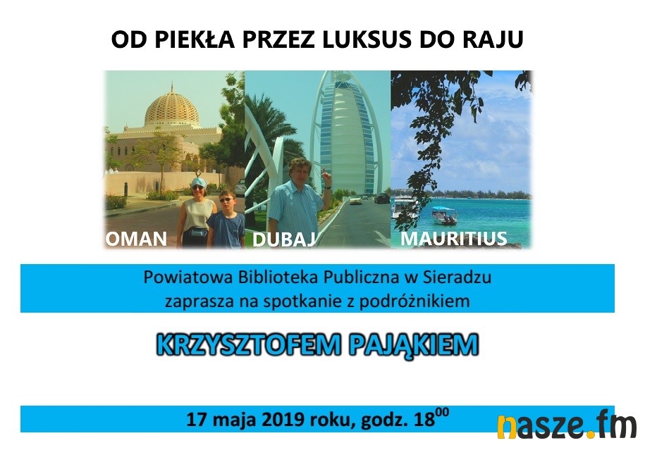 Tak zatytułowane jest spotkanie z podróżnikiem Krzysztofem Pająkiem, który dziś w Powiatowej Bibliotece Powiatowej w Sieradzu opowie o Omanie, Dubaju, Mauritiusie. Początek o godz. 18:00, wstęp wolny.