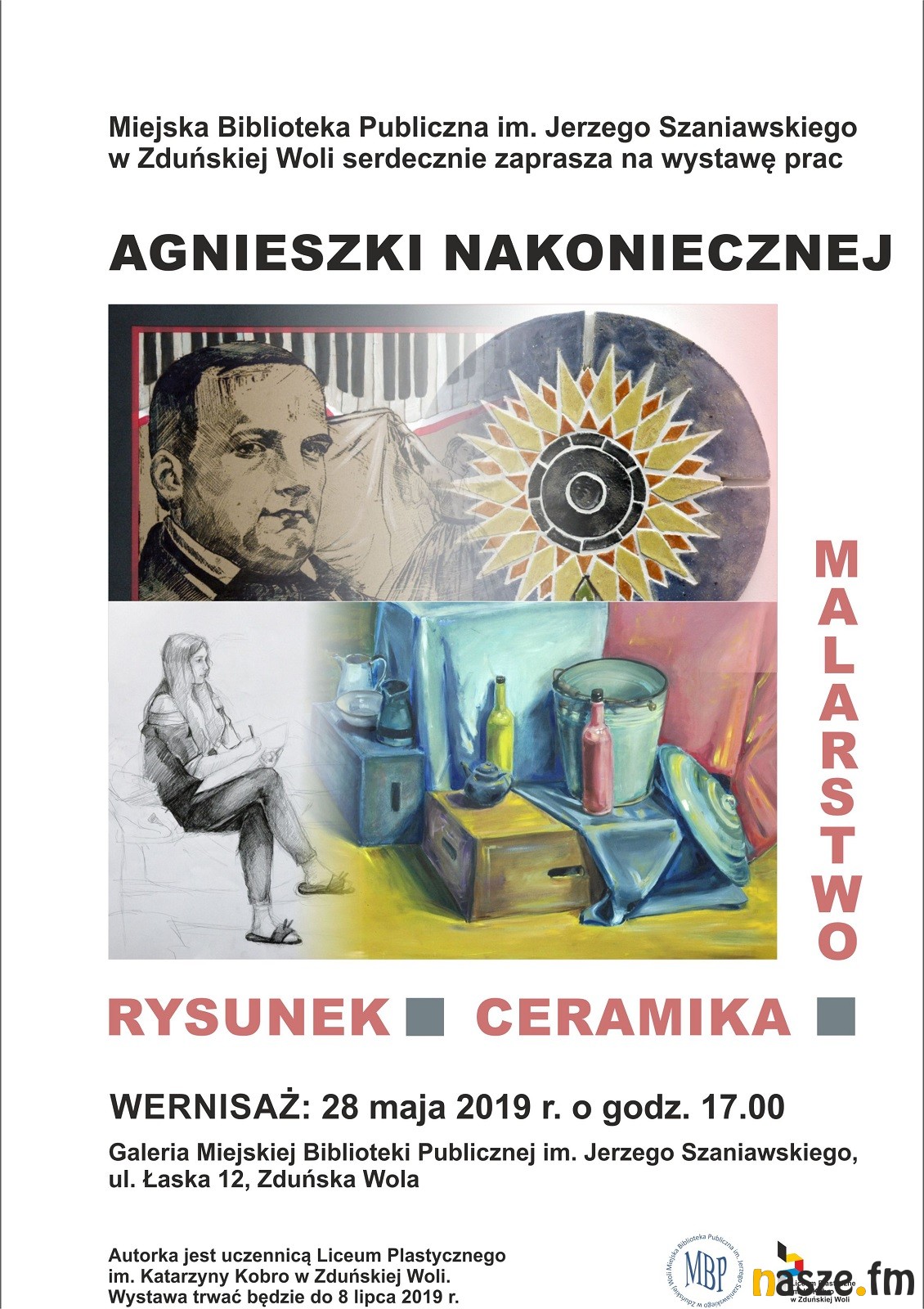 Miejska Biblioteka Publiczna im. Jerzego Szaniawskiego w Zduńskiej Woli zaprasza na wernisaż wystawy Agnieszki Nakoniecznej, uczennicy zduńskowolskiego Liceum Plastycznego. Na wystawie zaprezentowane zostaną prace z rysunku, malarstwa, a także ceramiki artystycznej.