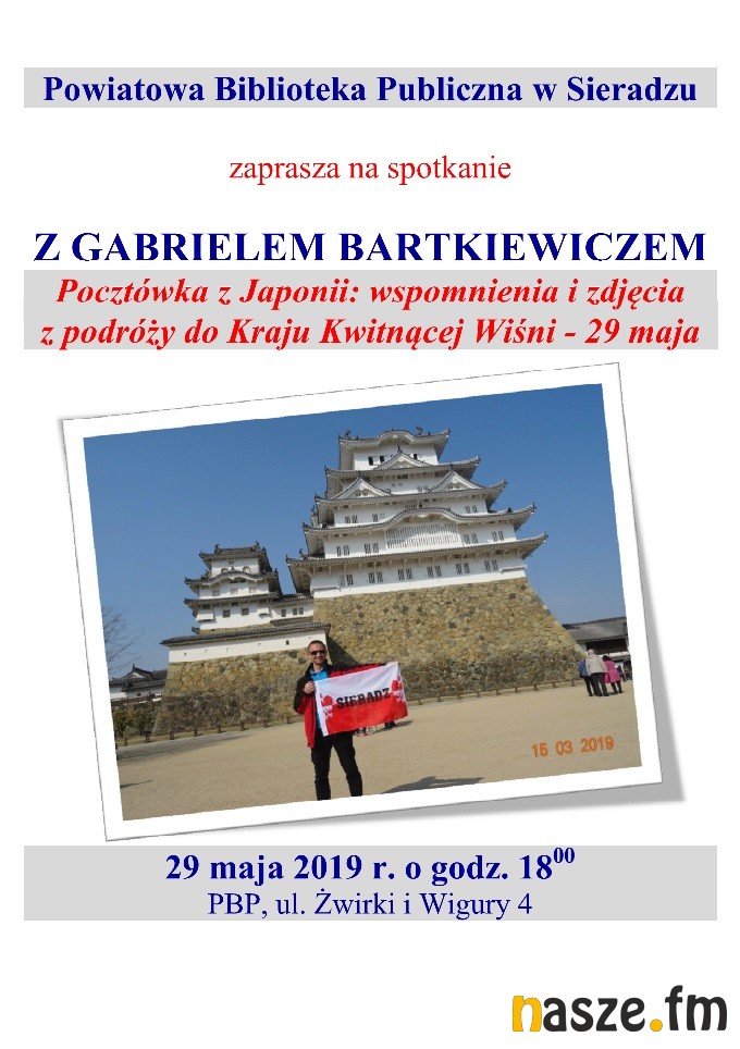 Powiatowa Biblioteka Publiczna w Sieradzu zaprasza w środę 29 maja na spotkanie z Gabrielem Bartkiewiczem "Pocztówka z Japonii: wspomnienia i zdjęcia z podróży do Kraju Kwitnącej Wiśni". Początek o godz. 18:00, wstęp wolny.
