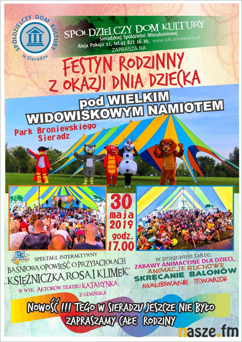 Spółdzielczy Dom Kultury w Sieradzu zaprasza dziś na Festyn Rodzinny z okazji Dnia Dziecka. Impreza odbędzie się w Parku Broniewskiego, pod wielkim, widowiskowym namiotem.