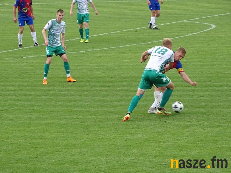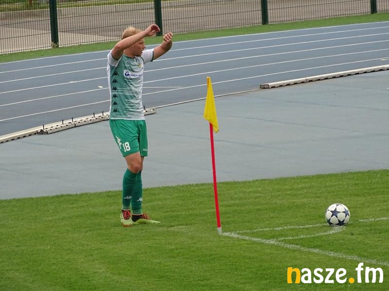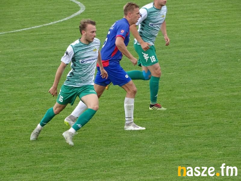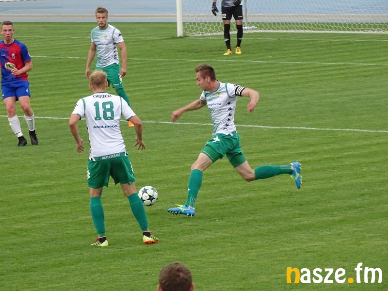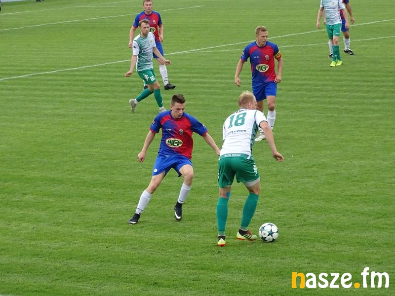 Gospodarze zaczęli dynamicznie i już w pierwszych minutach mieli szansę objąć prowadzenie. Dośrodkowanie na główkę otrzymał Przemysław Nawrocki, którego strzał nieznacznie minął bramkę przeciwnika. Kolejną szansę miał Łukasz Chojecki. Piłka po jego strzale poleciała jednak nad poprzeczką. Jeszcze lepszą okazję miał Nawrocki, który minął golkipera gości i nie trafił do pustej bramki. Sieradzka Warta dopięła swego pod koniec pierwszej połowy. Dawid Przezak otrzymał podanie z rzutu wolnego i z bliska zdobył gola dającego prowadzenie.