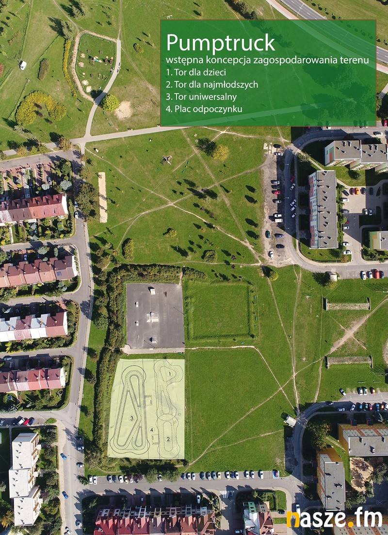 Magistrat planuje przy pumptracku wybudować jeszcze strefę wypoczynku o powierzchni ok. 450 m kw., która wyposażona będzie w ławki oraz stojaki rowerowe.